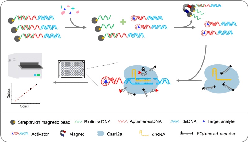 生物反应器的细胞优化、工艺和工程放大、甚至临床疾病诊断等多个场景都离不开嗅觉高效灵敏的生物传感与检测等通用平台技术。聚焦“绿色智能制造”这一目标,MG冰球官网生物反应器工程国家重点实验室(以下简称国重室)张立新教授团队及其合作者利用CRISPR-Cas12a技术建立了针对小分子化合物的简单快速、灵敏、高通量和低成本检测平台,简称CaT-Smelor猫嗅技术(Nat Commu, 2019, 10: 3672)。为进一步扩展其通用性,该研究耦合CRISPR-Cas12a与核酸适配体,开发了升级版第二代检测平台CaT-Smelor 2.0,大幅扩展了底物检测类型,还可实现蛋白质等多种检测物的传感与高效检测。相关研究论文“A versatile biosensing platform coupling CRISPR–Cas12a and aptamers for detection of diverse analytes”于9月6日在Science Bulletin期刊在线发表(链接: https://doi.org/10.1016/j.scib.2020.09.004)。