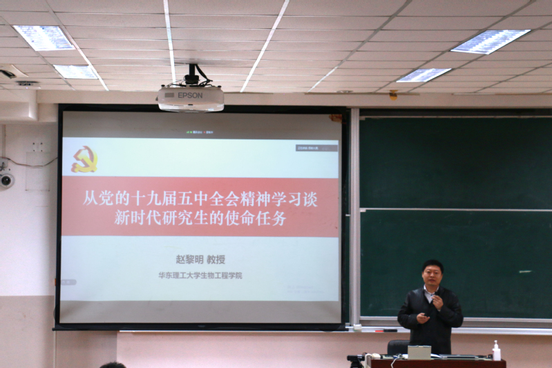 赵黎明教授从十九届五中全会精神、大学精神和大学思维以及新时代生工研究生的使命任务三个方面展开本次的思政课。他向同学介绍了十九届五中全会的主要精神内容、时代背景、历史及现实意义,特别就科技创新和人才强国战略结合学院学科特色和时代使命,并运用许多实际案例来鼓舞和激励青年学子们努力学习、勤奋求实、勇担使命,为实现第二个百年奋斗目标努力奋斗。赵黎明教授告诉研究生新生们,要承担伟大使命、奋力成才,必须具备大学精神和大学思维,他引用钱旭红院士“单靠知识改变不了命运,改变命运需要用思维架构起知识,从而支撑起足够高度和强度的人生大厦”的名言,指导同学们要学会运用逻辑思维、形象思维和格局思维来客观看待问题、分析问题和解决问题。研究生是国家的精英,应培养通过历史的维度、横向的维度、实践的角度看待和分析问题的能力,要增强“四个意识”、坚定“四个自信”、务必做到“两个维护”。