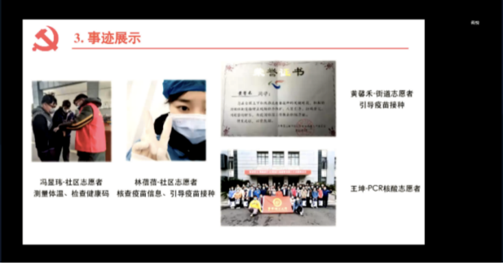 上海进入抗疫“最关键、最吃劲”阶段,疫情就是命令,防疫就是责任。会上党员同志从自身实际出发,讨论并交流在当前特殊阶段,如何更好地响应国家号召,发挥党员作用,履行初心使命。生工系教工党支部的夏杰说到,上海市疫情正处于高峰期,各位党员同志要时刻关注最新动态,作为党员要冲锋在前,善于发现问题,勇于提出问题,敢于解决问题,做好表率。来自国重室研究生第四党支部的王坤迅速响应国家号召和人民需求,主动报名MG冰球突破官网网站第二批PCR检测志愿者,现已随队出征,正在一线实验室。王坤表示,很荣幸能为上海市疫情防控贡献出华理力量,虽然前线的工作很辛苦,但志愿者们敢吃苦能吃苦,大家团结一致,必将打赢这场硬仗。由于现在上海市防控形势仍然复杂严峻,他表示,作为一名党员必须以身作则,遵守纪律,服从命令,坚持就是胜利,坚持才能胜利。生物学与食品科学硕士奉贤党支部的王奕嘉同志分享了在学校封控管理期间,她与室友一起解压放松的方式,虽然很遗憾不能奔赴前线,但会在后方传播正能量。