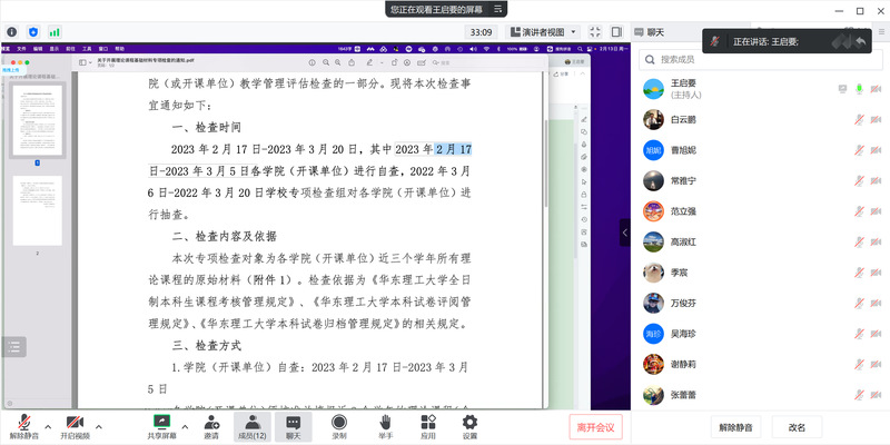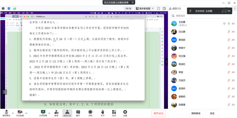 根据学校审核评估基础材料检查和开学前准备工作线上会议精神,为做好本科教学评估和开学前的各项准备,MG冰球突破官网网站于2023年2月13日组织召开线上本科评估工作会议,学院各系主任、副主任、本科教学工作教师骨干、教务员等参加了此次会议。会议由教学副院长王启要主持。