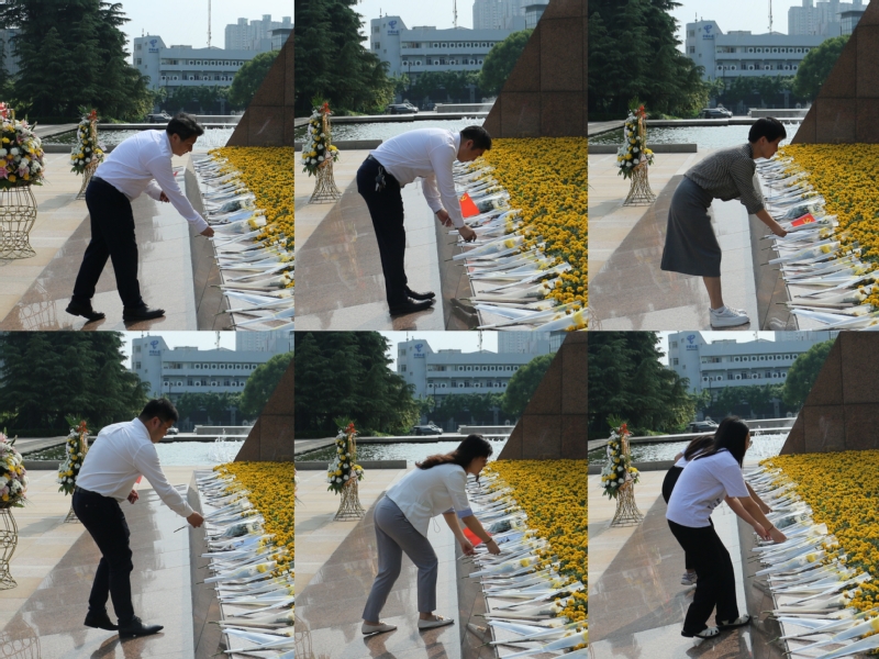 在龙华烈士陵园主广场,学院一行排列整齐,手持寄托哀思的菊花,静静伫立在烈士纪念碑前。两名学生党员抬护着花篮,代表学院向革命烈士献花篮,花篮挽联上写着“英雄烈士永垂不朽”8个大字。在庄严肃穆的氛围中,学院一行一起向革命烈士三鞠躬默哀,并依次向革命烈士献花。