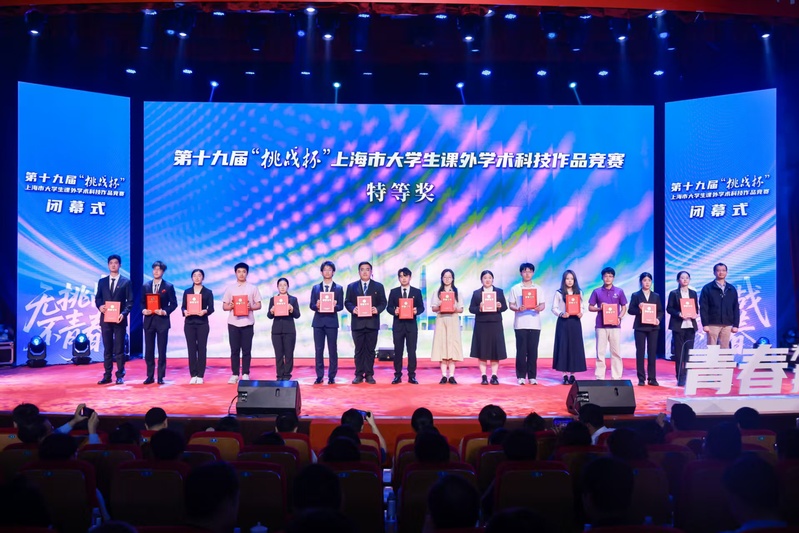 图片说明:第十九届“挑战杯”上海市大学生课外学术科技作品竞赛颁奖现场(左八为团队负责人杨永康)