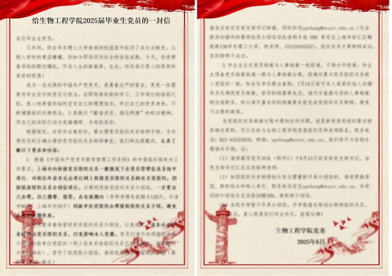 此外,一封信中还详细讲述了毕业生党员组织关系转接的具体流程、注意事项及时间要求,为党员们顺利接转组织关系提供了清晰指导。