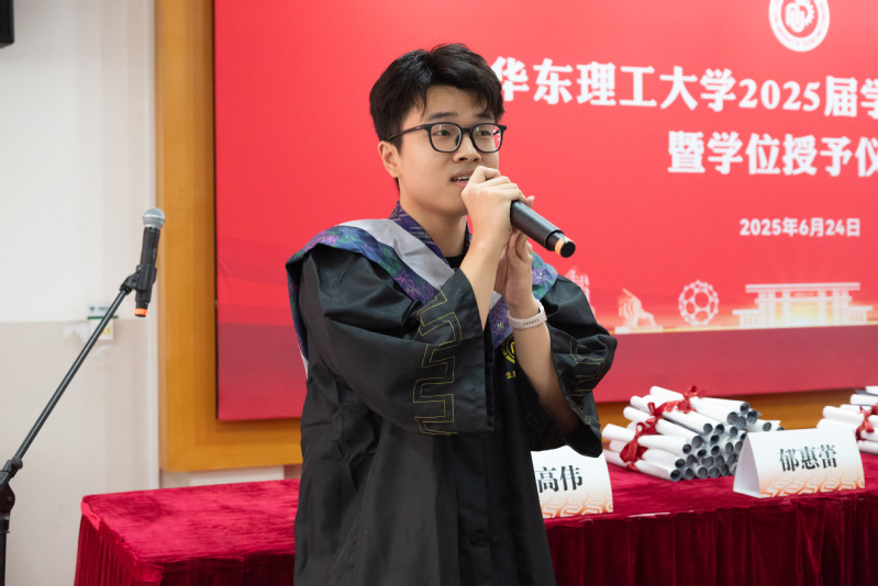 2025届食品科学与工程专业硕士研究生张茜代表研究生发言,在华理滋养与生工基因的培育下,她心怀热忱,积极服务社会;追求真理,将知识应用于疾病诊断。她呼吁同学们,无论身处何方,都要始终牢记母校给我们的底气,并在各自领域彰显生工人的力量。同时深情表达了对母校和老师们由衷的感谢以及对同窗们真诚的祝福。
